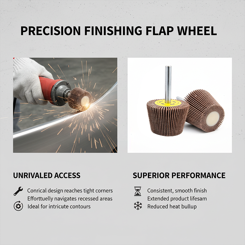 Conical flap wheels feature radial abrasive flaps built on a tapered body. This geometry delivers:
