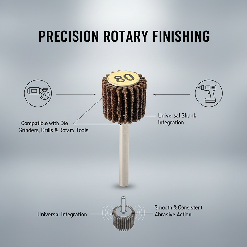 Cylindrical flap wheels are positioned as surface conditioning and blending tools focused on uniform scratch patterns and smooth transitions.