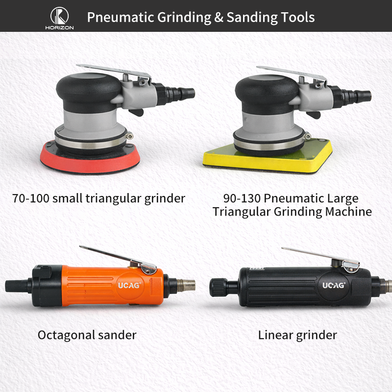 These pneumatic tools are powered by compressed air, offering high power density and low vibration, making them ideal for extended use in high-intensity tasks. Each tool is designed for specific operations, such as the pneumatic random orbital sander for large surface sanding, the pneumatic angle grinder for fine polishing, and the pneumatic belt sander for large area grinding.