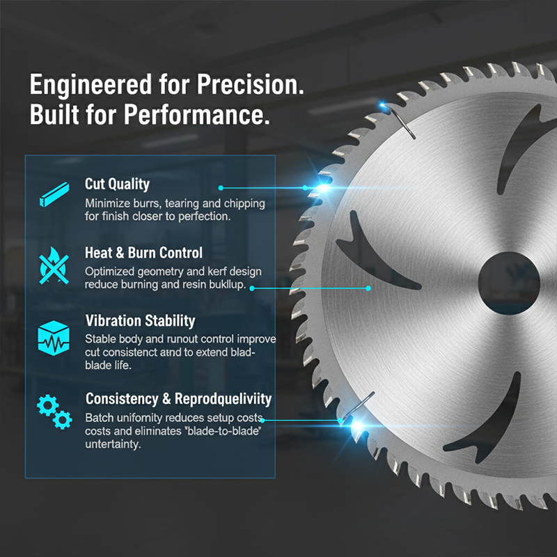 Wood cutting trades off throughput vs heat/tear-out risk. Fine finishing uses higher tooth count but changes load and noise behavior. Engineering control comes from: